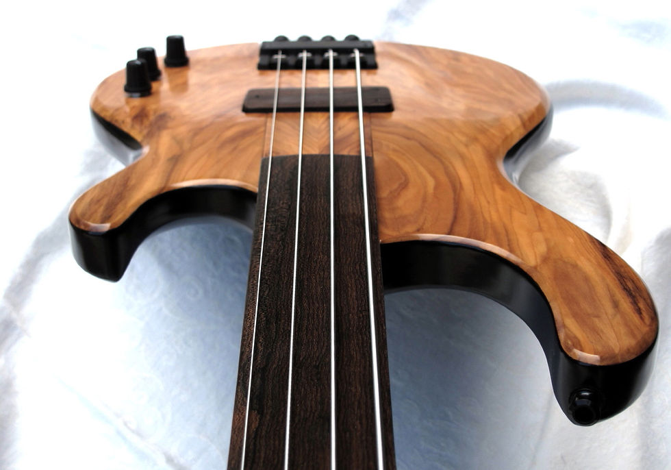 Specs: Olive wood top from Cyprus, hence the Greek goddess reference. Semangkok body, Macassar ebony back plate, wenge/blackwood ebony neck and pickup casing. Zericote fingerboard. Black burst on sides and back. ETS/Müb tuning and string anchor system. Bartolini CBJD pickup and 2 band preamp.